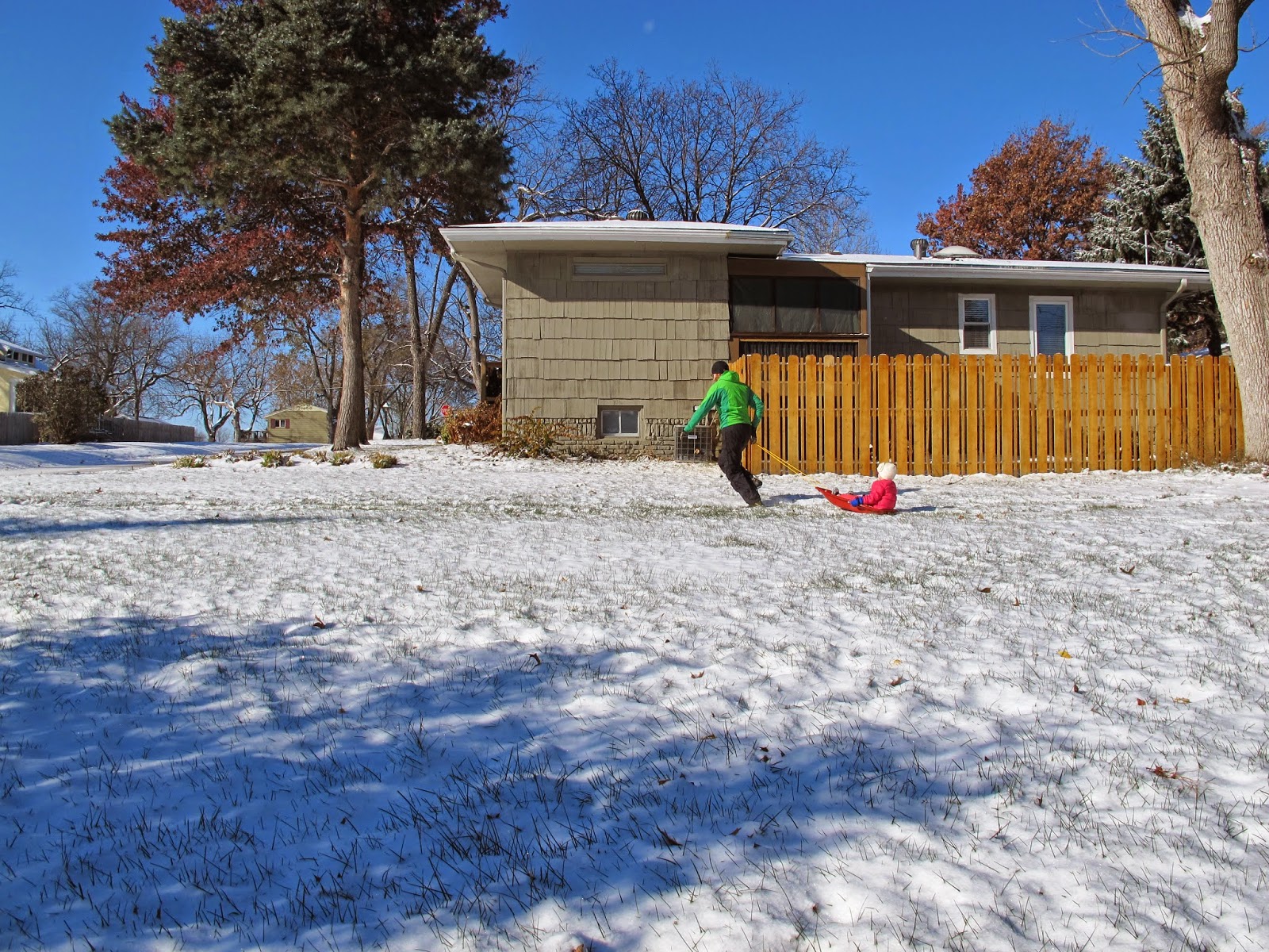 After a very, very warm and gorgeous October, Mother Nature didn't waste any time and got us ready for winter in a hurry. First up, cold, cold temps for a week or two and then finally, the first snow. It was only about two inches, but Kate was pretty pumped about it this year (last year's only sledding adventure ended in epic tears) so we bundled her up and got her on the sled before she could even think about it. And wouldn't you know it? Homegirl actually had fun.
